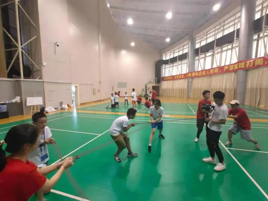 团建小游戏包括拍纸牌和接力传球。接力传球的规则是两人一组同时拉紧两根绳子,让网球从绳子的一端滚动到另一端,一队10人分成5组,组成五边形,小球走完一个五边形为成功。大家都付出了努力,在团建结束后,营员和助教们都收获颇丰。
